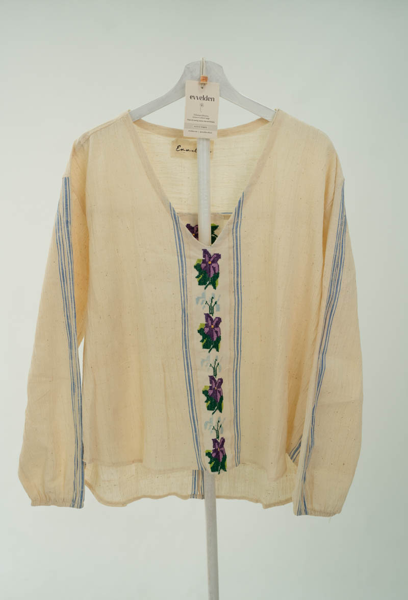 • Kullanım: El yapımı V yaka kanaviçe işli uzun kollu bluz